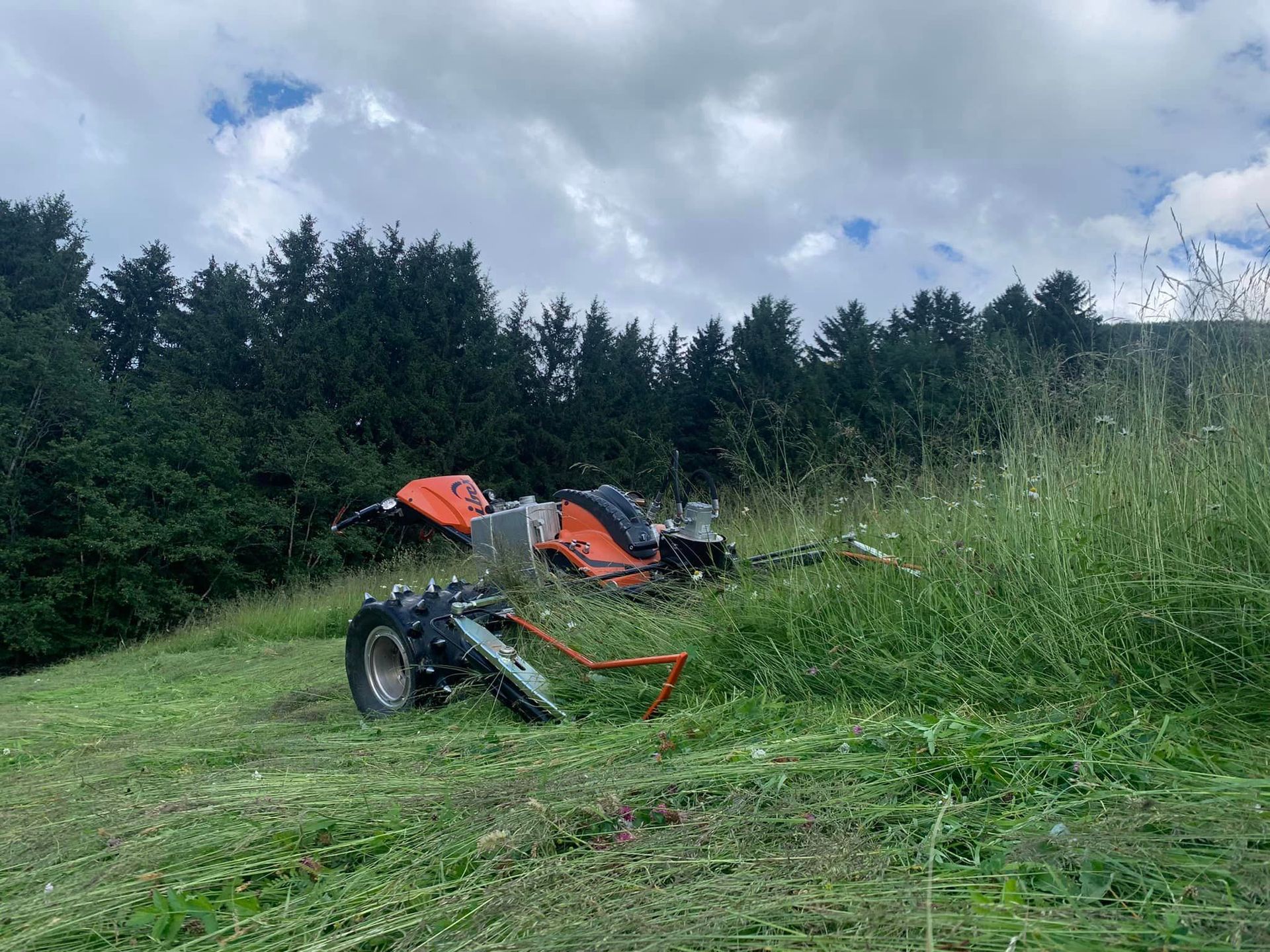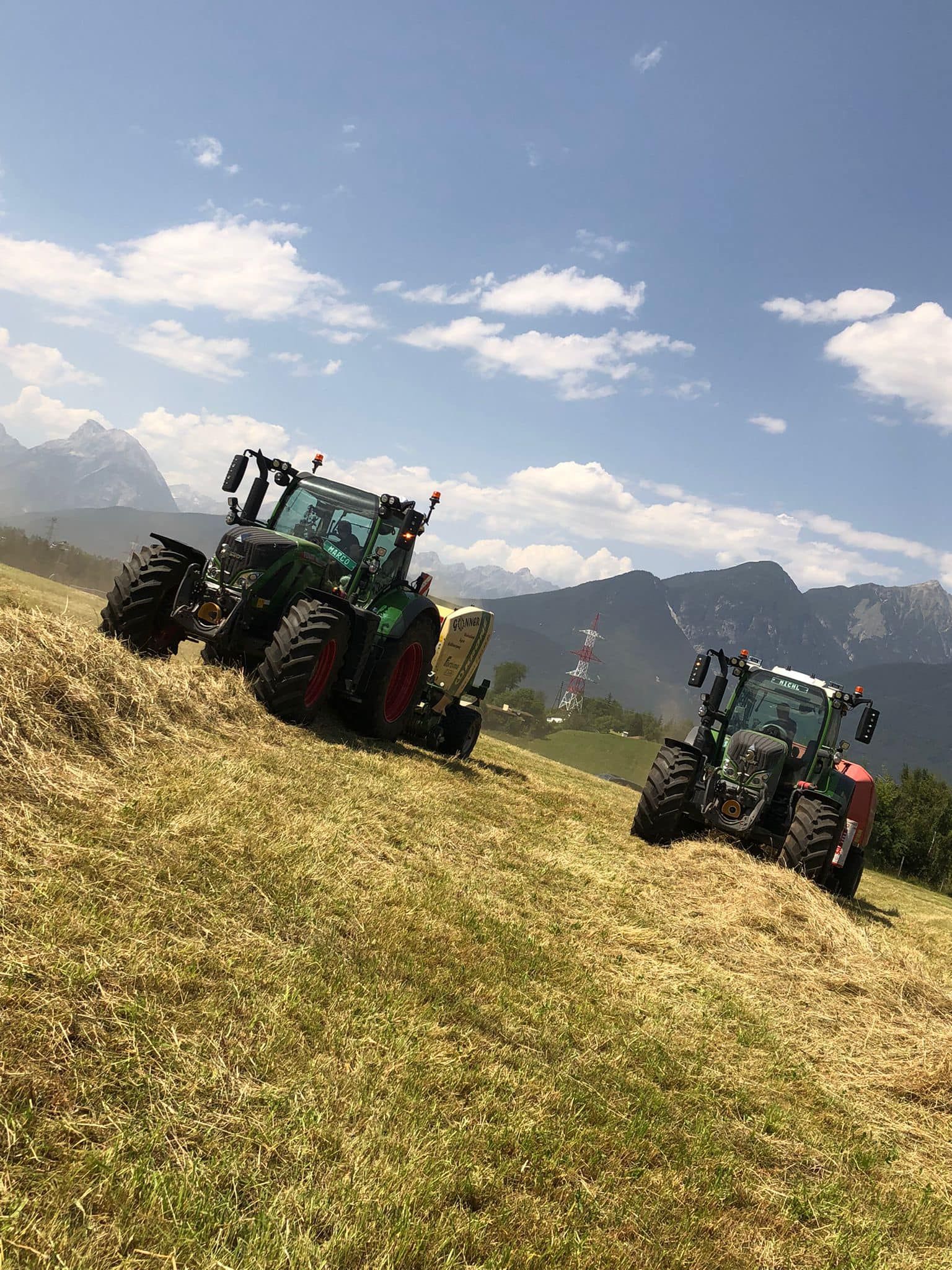 Da bei uns Presse und Wickler getrennt sind, können wir in mäßig steilem Gelände fahren, ohne größere Schäden an der Grasnarbe zu verursachen.